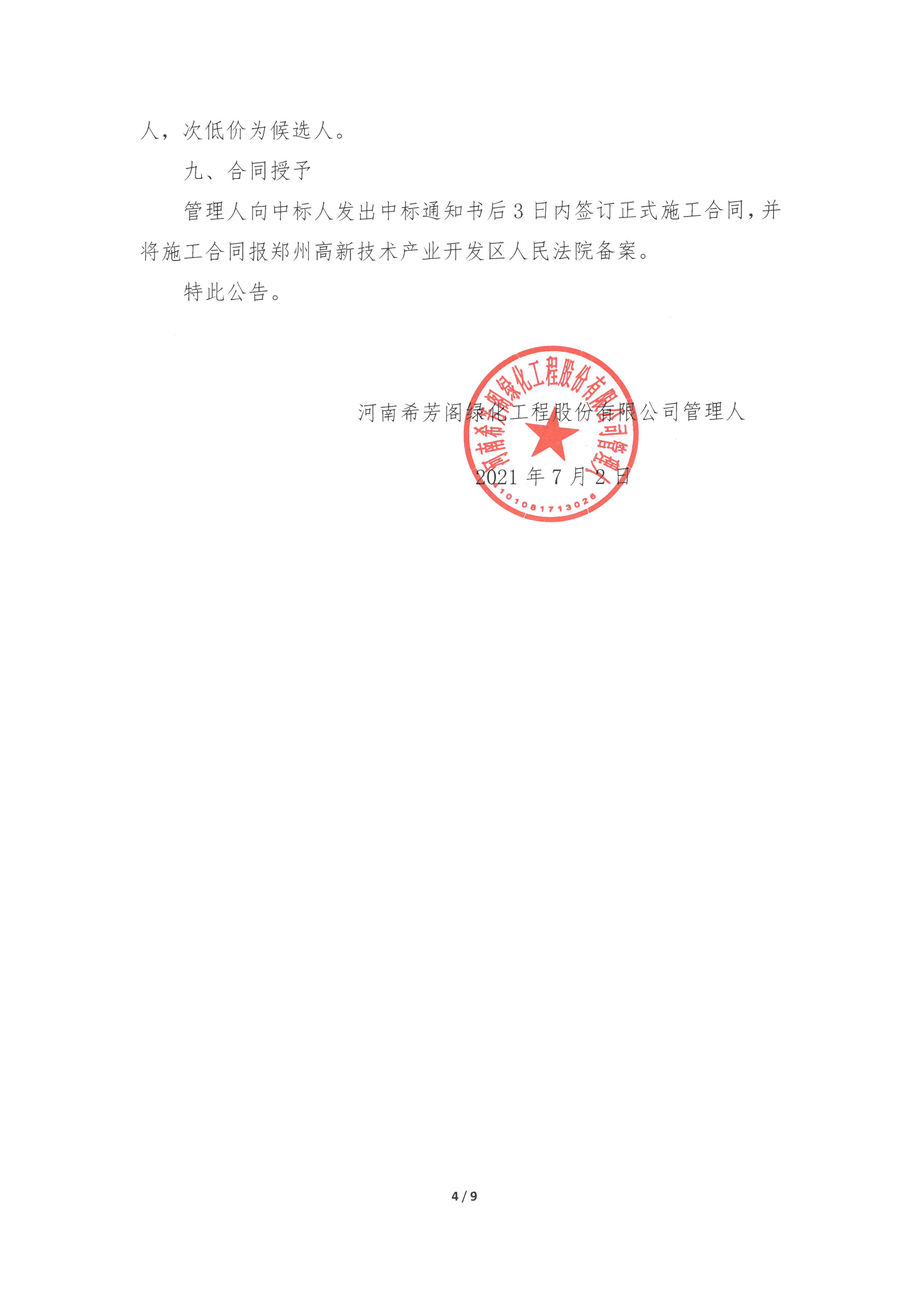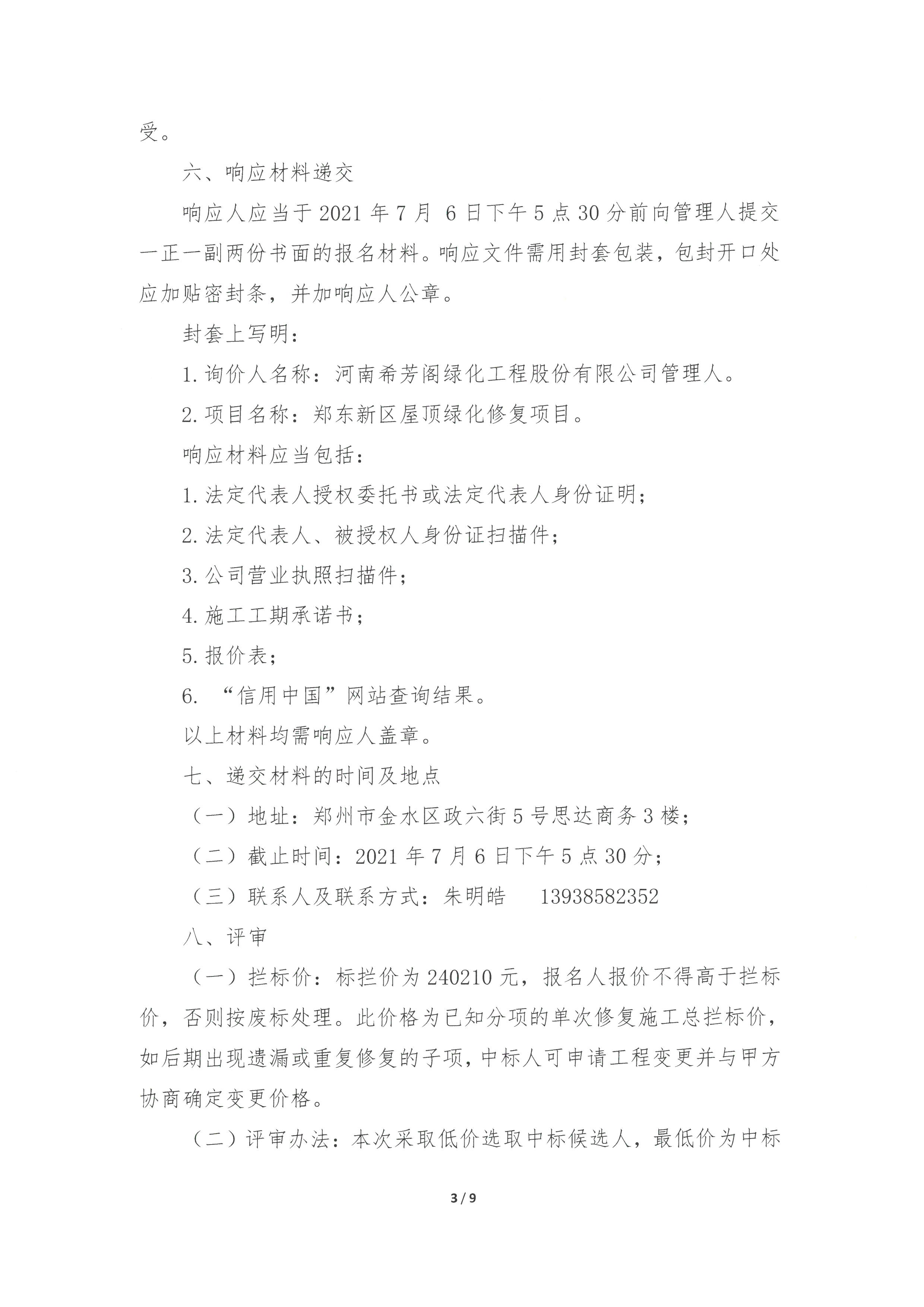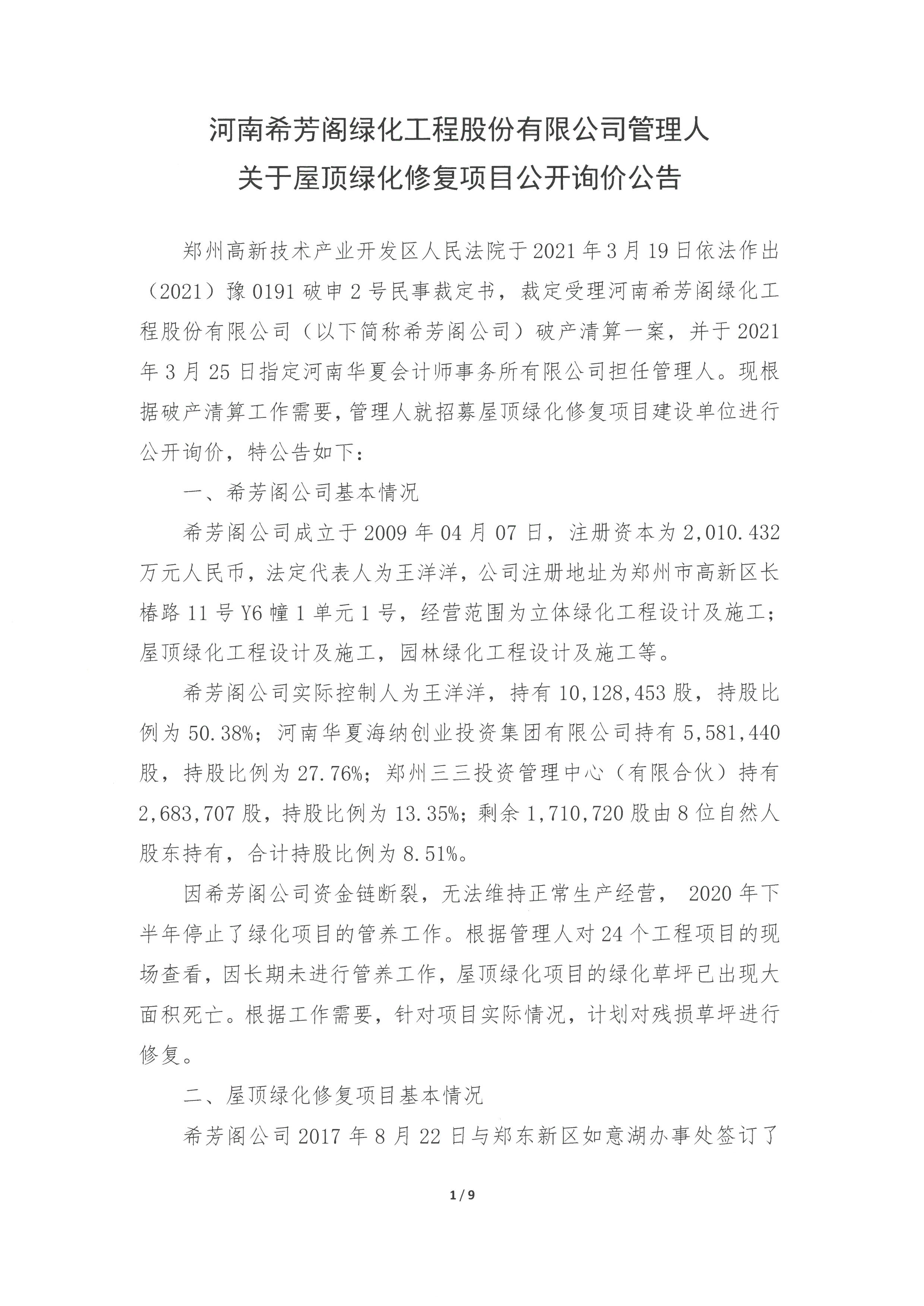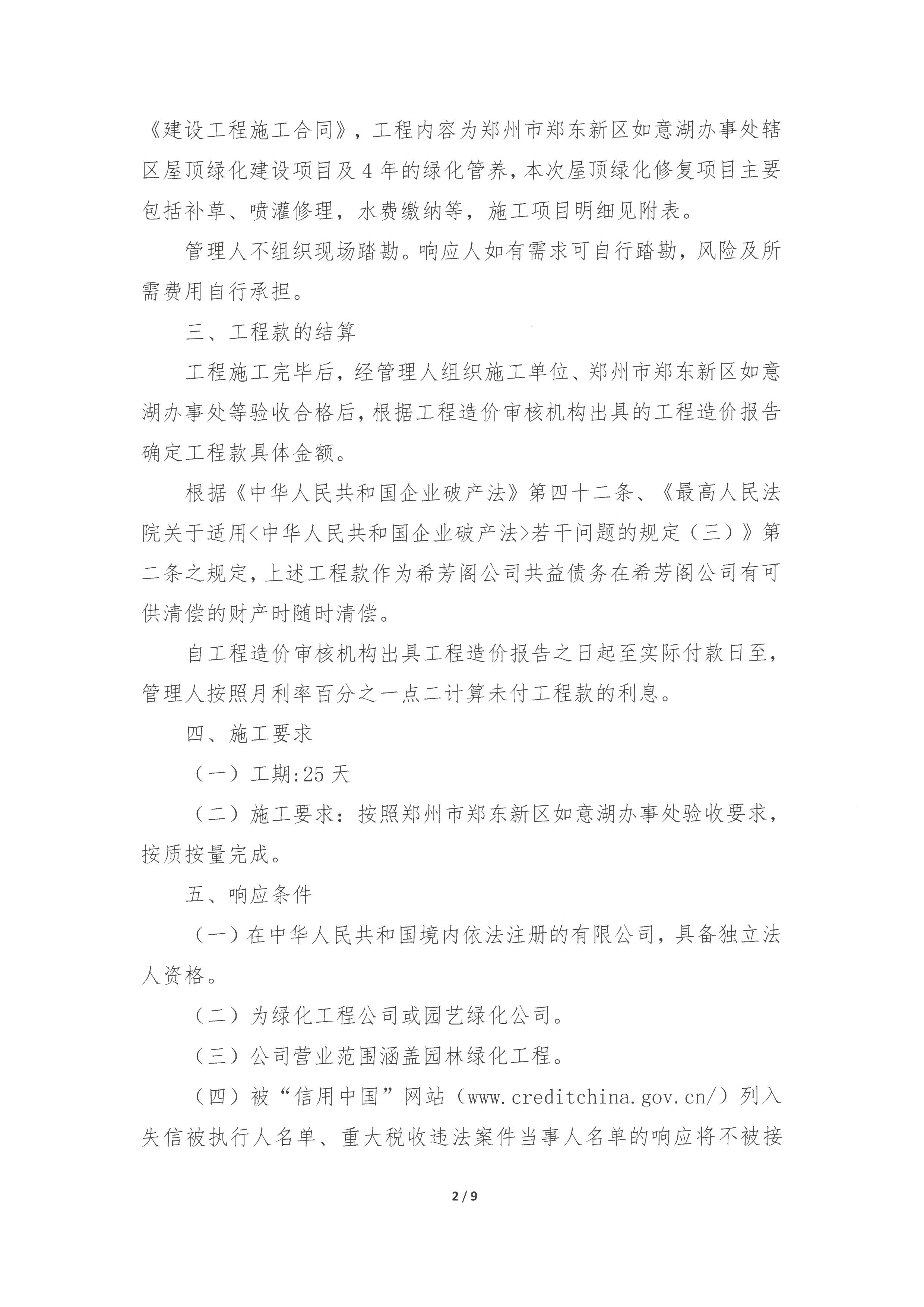 河南希芳阁绿化工程股份有限公司管理人关于屋顶绿化修复项目公开询价公告