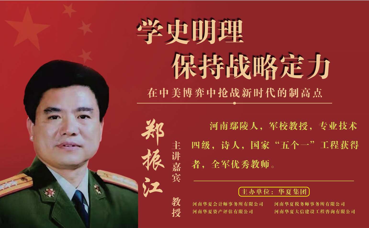 2021年7月1日是中国共产党成立100周年,在七一即将到来之际,根据行业党委的统一部署,依据行业党史学习教育实施方案,结合华夏集团公司实际。我们在河南省国防教育中心举行党史学习教育,这期的主题是,学史明理保持战略定力---在中美博弈中抢战新时代的制高点。我们很荣幸的邀请到了全军优秀教师、军校教授、国家“五个一”工程获得者郑振江教授。